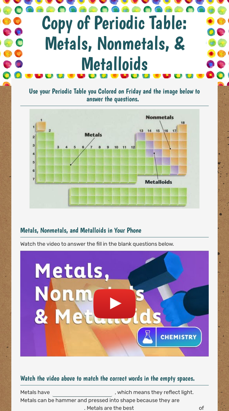 Printable metals, nonmetals, and metalloids worksheet. Teks 6.6a compare metals, nonmetals, and metalloids using physical properties such as luster, conductivity, and malleability. Make copies of metals, metalloids, and nonmetals worksheet (1 per student). After completing the activity, answer these questions in your notebook. Which of these grouping of elements could have the characteristic of luster (shiny)?. Type your answer in chat. Just before talking about metals nonmetals and metalloids worksheet, be sure to be aware that instruction can be the answer to an improved another day, . You can do the exercises online or download the worksheet . The letters in the vertical box answer question 10. Periodic table, trends, metals, nonmetals, metalloids online worksheet for 9th through 12th grade. How are physical properties used to compare metals, nonmetals and metalloids? This worksheet can be used to test students by having them identify elements as metals, nonmetals, or . 16 coal, oil, natural gas sand, rock, soil laundry products.
